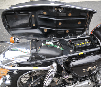 シート下。シートは横に開きます。モノを入れるスペースなんてまるっきりありません。バッテリの横に、筆箱が入るかな?くらいの大きさの小物入れがあるだけで、雨合羽とかそういうものを常備しておくのは不可能です。それでもバッテリの上にはETCを取りつけてもらいましたので、バッテリの上になら若干余裕はあるようです。文庫本一冊くらいでしょうけど。いちおうシートの後部には書類ケースはありますので、車検証などは折りたたんで入れておけます。紙しか入らない厚さなので、ここにETCを……とかは不可能です。 ヘルメットホルダもここにあり、前と後ろで二つのヘルメットがかけられるようになっています。あまり使い勝手はよくありません。 |