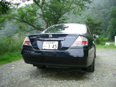 リヤは反対に非常に挑戦的な(という言葉でいいのかわかりませんが)デザインです。顔立ちに比べるとずいぶんイメージが違いますが、これはこれでなかなかまとまってるんではないでしょうか。それでも、ほのかに日本的なイメージを残しているのが不思議と云えば不思議です。それだけまとまりのあるデザインだということなのかもしれませんが。 これだとわかりませんが、わずかにハイデッキになっているため、実は後ろの視認性はあまりよくありません。もともと全体的に大型のセダンなので後ろの見切りはさほどいいわけではなく、バックのときなどには結構気を使います。 |
